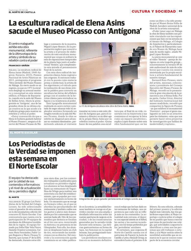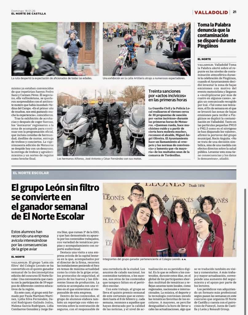 Nuestro taller de periodismo ha logrado alzarse con el galardón más importante del concurso, “Mejor edición digital”, un reconocimiento que distingue a nuestro equipo “León sin filtro” (formado por nuestros estudiantes Lydia Silva, Daniel Rodríguez, Malena García, Lidia Combarros, Jorge Sierra y Paula Martínez) como el mejor periódico escolar del curso 2025/2026 en Castilla y León.