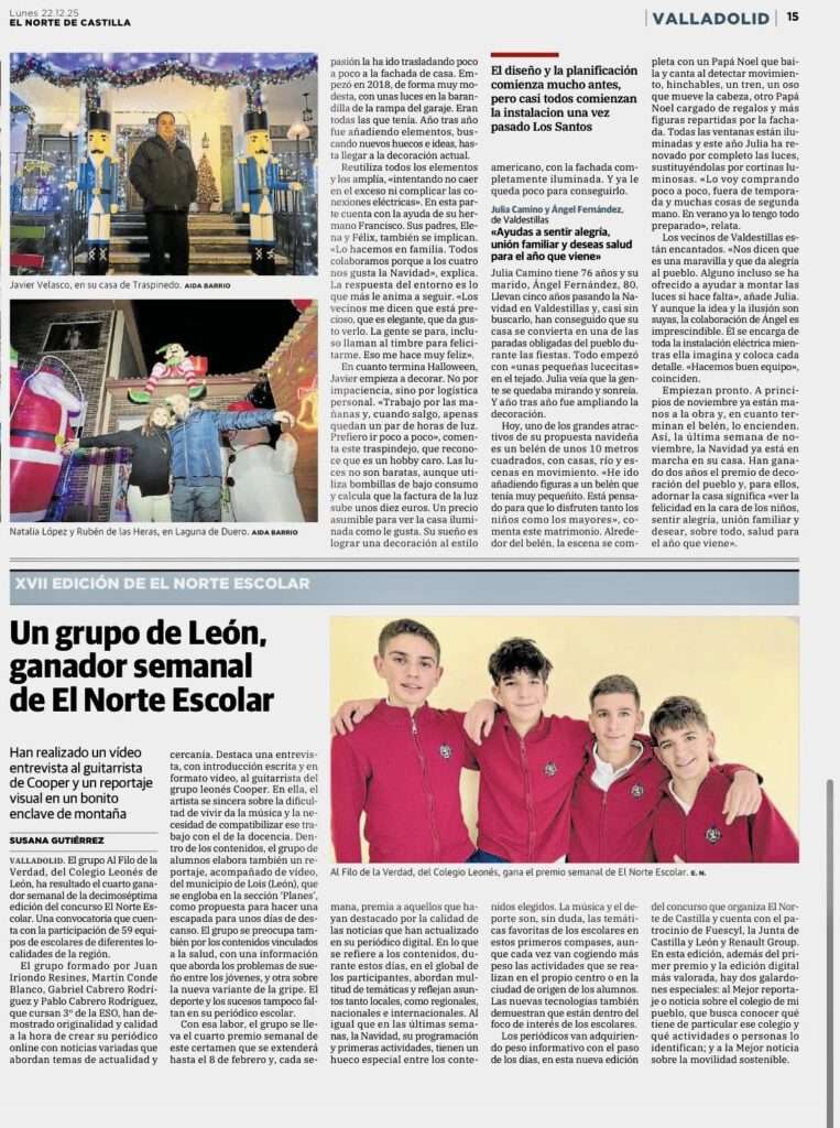 Este curso está siendo especialmente excepcional para nuestra actividad de Taller de Periodismo en 3.º de ESO. Además del equipo ganador, hemos obtenido en dos ocasiones el reconocimiento como “Mejor periódico de la semana en Castilla y León” con nuestros equipos “Al filo de la verdad” (formado por nuestros estudiantes Juan Iriondo, Martín Conde, Gabriel Cabrero y Pablo Cabrero) y “Los periodistas de la verdad” (formado por nuestros estudiantes Sofía P. Vela, Daniela Civantos, Carmen Mata, Pablo López y Mario Chousa), consolidando así nuestro taller como uno de las más sólidos de toda la comunidad autónoma en la última década.